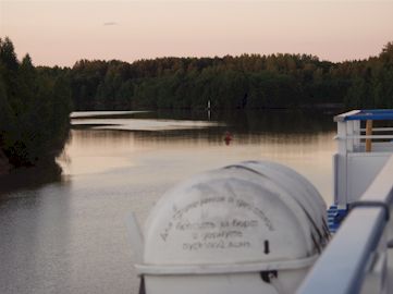 ヴォルガ・バルト水路の岸でこんな標識を見つけた。標識に書かれているように帝政時代19世紀に工事が行われた運河で、暴風雨の多いオネガ湖上を通らずに船が運航できるようにという意図だったらしい。現役の運河でなく運河「跡」なのかもしれないが、ネット上の情報では、2011年にヴォログダ船籍の「ニコライ・ヤコヴレフ」号がクルーズ客を乗せて久しぶりにオネガ運河を通過し、今後もそのようなクルーズを計画しているとあった。ヴォルガ・バルト水路の岸から右の写真のような水路が伸びていたが、これだろうか。 (2009年8月撮影)