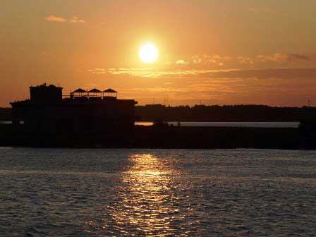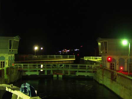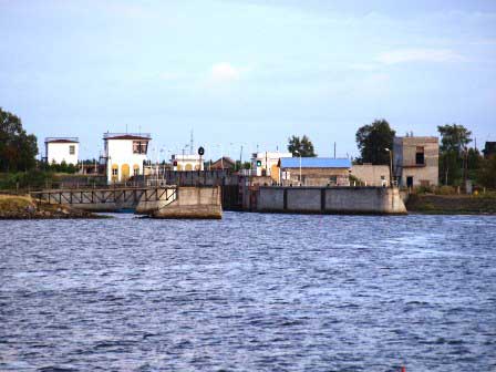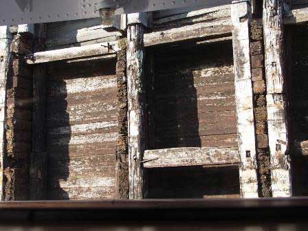 この運河の閘門はすべて撮影禁止で、実際、銃をもった警備兵が配置されていて、ソ連時代に戻ったのではないかという錯覚にとらわれるほどだ。左の写真は、それを知らずに撮ったもので、直後にロシア人の船客から撮影が禁じられていることを教えられた。右の写真は、船室の窓越しに撮影した閘門の擁壁。驚いたことに、コンクリートではなく木で出来ていた。まさか、スターリン時代のままではないだろうが。 (2009年8月撮影)
