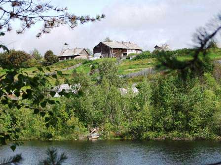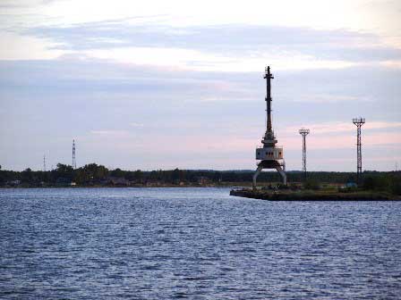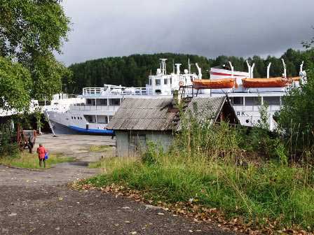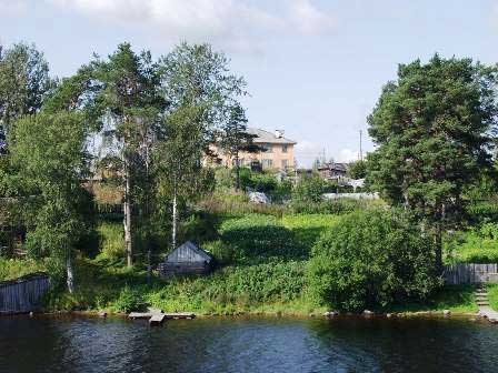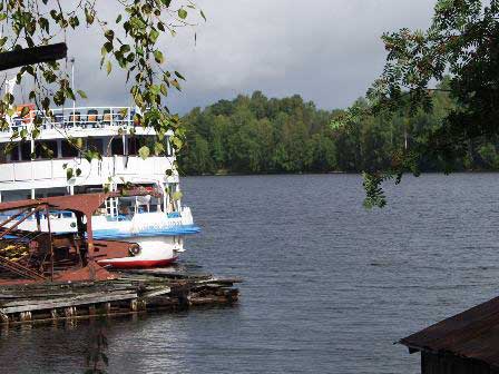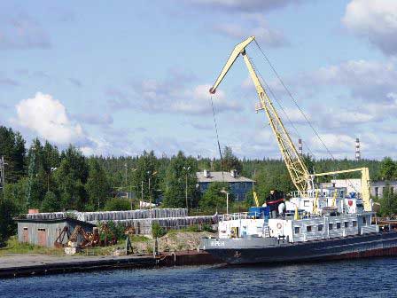 白海・バルト運河の沿線にある小さな町。町には、アルミの精錬工場があると船客が教えてくれた。左の写真に写っているのは、北方鉄道の貨車。原材料や製品を運んでいるのかもしれない。 (2009年8月撮影)
