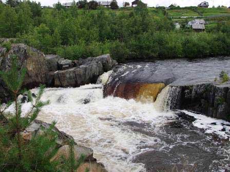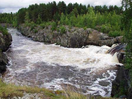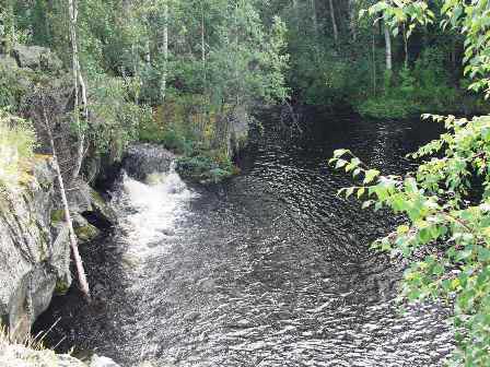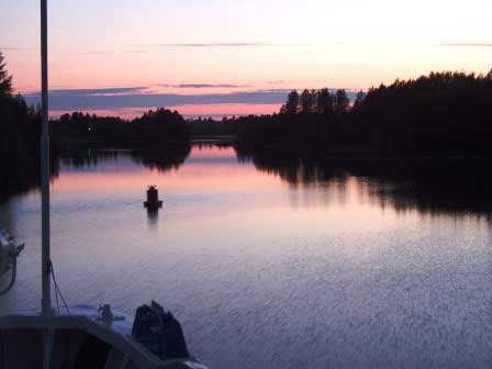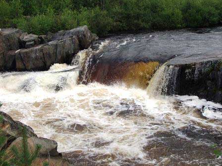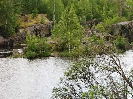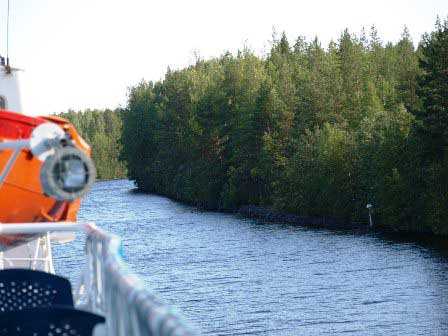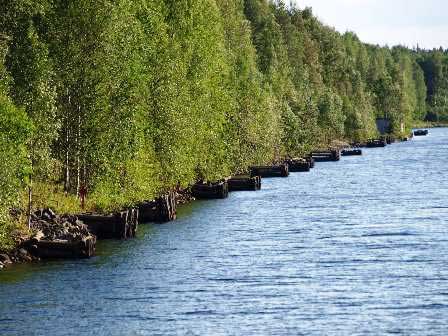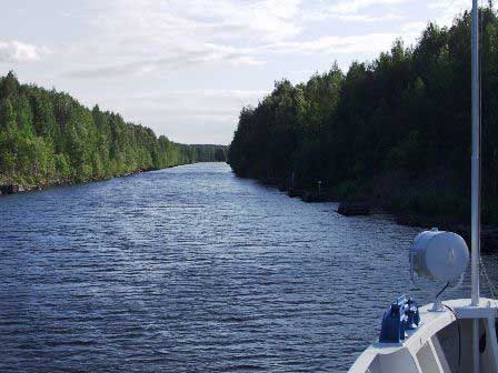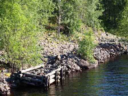 オネガ湖と白海を結ぶ運河。場所によっては水路の幅がとても狭い。下段の写真は、石積みの護岸。 (2009年8月撮影)