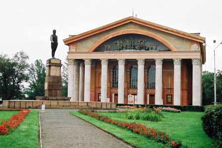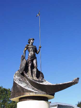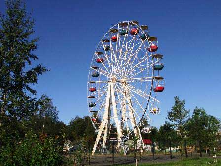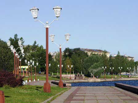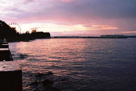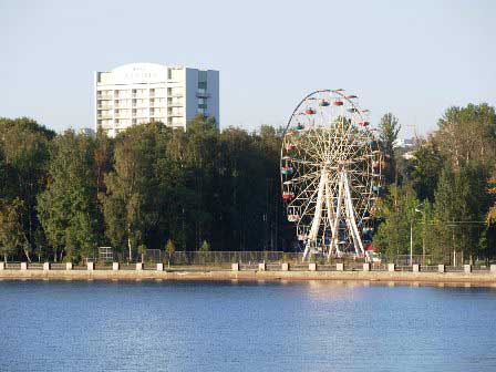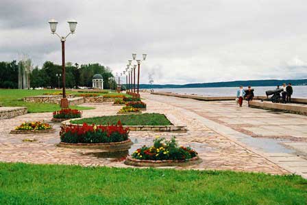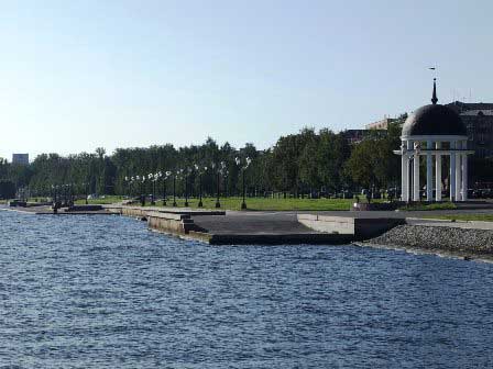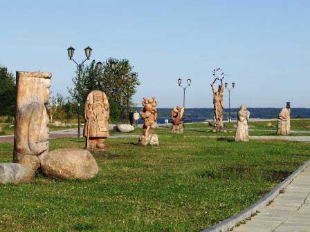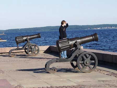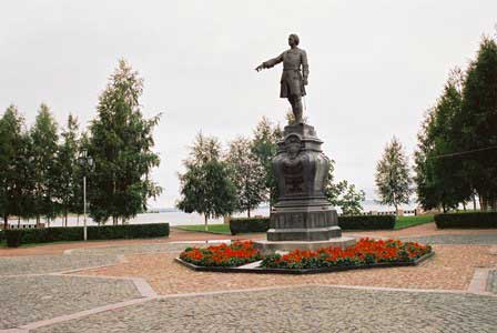 カレリア共和国の首都ペトロザボーツクはオネガ湖の西岸の町。湖畔に沿って遊歩道ができていてそぞろ歩きができる。この都市の名前はピョートルI世が大砲工場を建てたことに由来し、湖畔の公園にはそのピョートルI世像が立っていた。 (1998年8月撮影) |