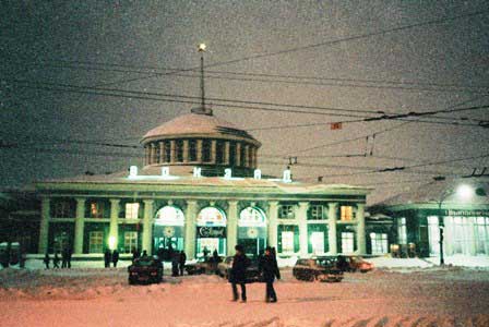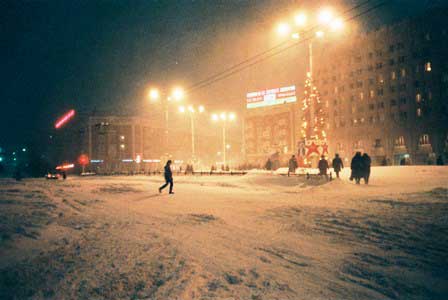 北極圏コラ湾の岸にある港湾都市。訪れたのは12月下旬だったのでほとんど終日このような景色。左は鉄道駅、右は駅からすぐ近くにある広場。 (1985年12月撮影)