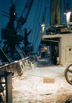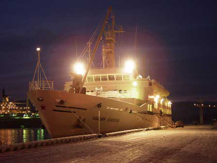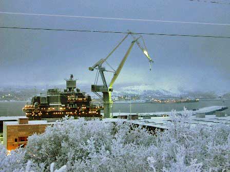 このあたりはコラ湾と呼ばれる入り江が奥深くまで入り込んでいる。写真は、湾内に停泊してメンテナンスを受けている砕氷船。 (2005年12月撮影)