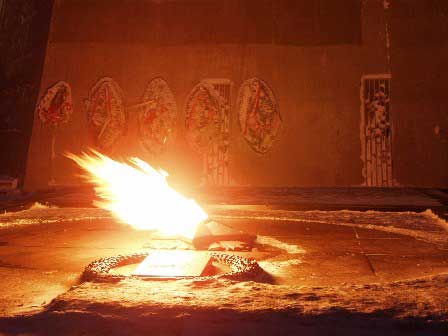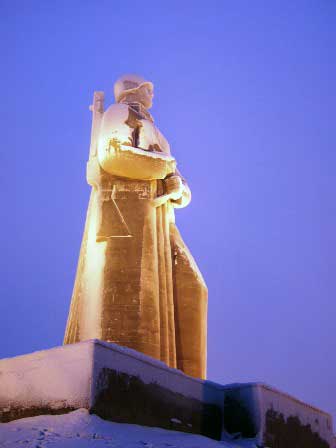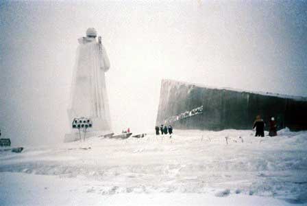 市の背後にある丘。第二次大戦で倒れた兵士を慰霊する巨大なモニュメントがある。1985年に私たちが訪れた時はひどい吹雪で、乗ってきたバスに戻るのもひと苦労だったし、2005年の訪問時には深い霧だった。 (上:1985年12月,下:2005年12月撮影)
