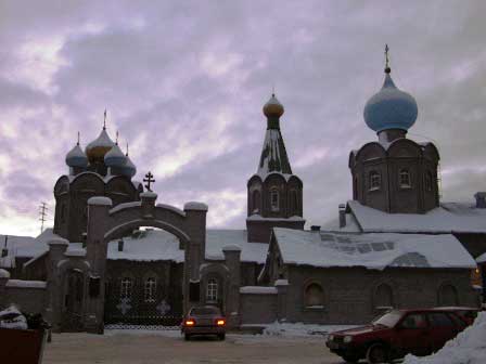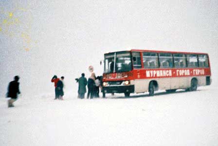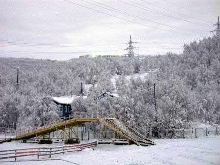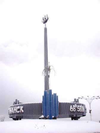 | 隣接するコラ市との境にある標識。日本と同じようにロシアでも市町村境にはそれを示す道路標識が立つが、大都市に入る大きな街道沿いにはこういうモニュメントのような立派な標識が建てられることが珍しくない。緯度表示が、北極圏内であることを示している。 (2005年12月撮影)