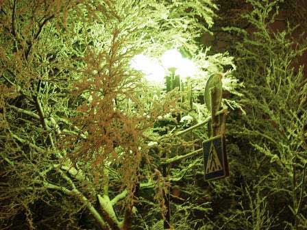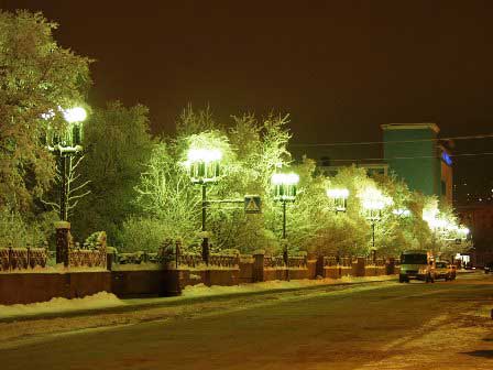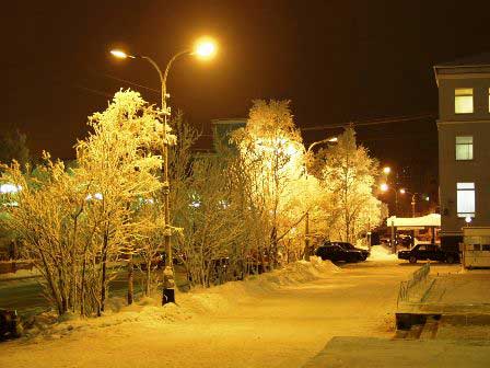 市内の通りの風景。撮影したのは午前10時近く。街路樹が雪をかぶっているが、街路灯の発する色によって様々に見える。 (2005年12月撮影)