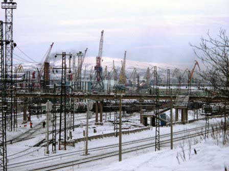 鉄道駅に隣接するヤード。もちろん、港からすぐのところにある。この町がロシア北方の流通の拠点であることがよくわかる。 (2005年12月撮影)