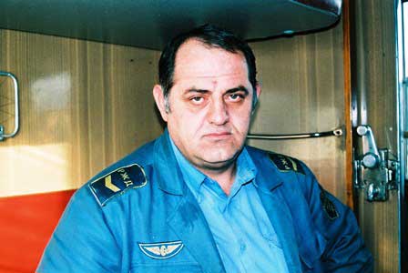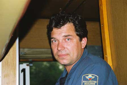 ロシアの鉄道は長距離列車が多い上に、車掌は途中で交代しないし、先方も停車駅以外ではそれほど忙しいわけではない(?)から鉄道旅行でいちばん最初に仲良しになるのは車掌のことが多い。ヒマなものだから人のコンパートメントの入り口(実はこの時は車掌専用の仮眠室をあけてもらっていたのでほんとうは彼の部屋だが)に来ておしゃべりを続ける車掌。 (1998年8月撮影・北方鉄道)