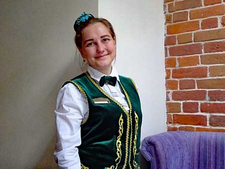 カザン市内のレストランに寄って昼食を取った時に我々のテーブルを担当してくださったウェイトレスのかた。ちょっとタタール風にも見える制服を身につけていた。 (2019年3月撮影)