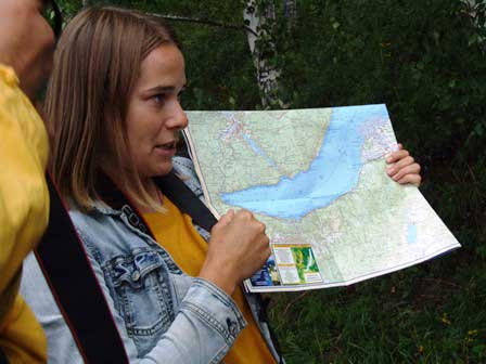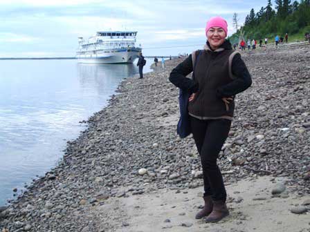 バイカル湖クルーズ船のガイド、ダーシャさん。船客の数が40人ほどで、ちょうど、クラスを上手に束ねる担任の先生のようだった。 (2016年8月撮影・バイカル湖畔トルスティ岬)