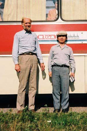 エクスカーションにはバスを使うことが多く、ちょっと長い旅になるとガイドさんばかりでなく、運転手さんとも仲良しになるのは必然。突然バスを止めたりして何事かと思ったら道ばたで売っていたスイカを買ってきてみんなにわけてくれたりという経験もある。写真はバルト三国をバスで北上した時のリガのドライバー。年輩の方で安心できる運転だった。 (1987年8月撮影・リガ〜タリン間)