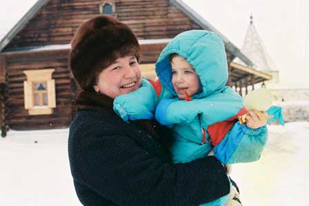 旅行に行くようになって最初に親しくなる現地の人と言えばやはりガイドさんであろう。左の写真はウラジーミルのインツーリストに所属していた人。ヨーロッパからの観光客の子どもを抱いているところ。 (1987年12月撮影・スズダリ)