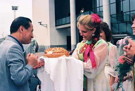 私たちがウラジオストクの港に上陸した時、伝統的な「パンと塩」で歓迎してくれた若い女性。 (1991年8月撮影)