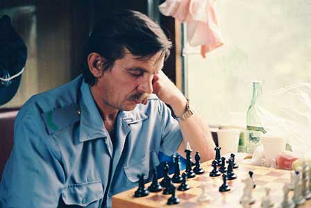 長距離の急行列車になると停車駅の間隔も長く、こうしてチェス盤を前にしていくら長考してもほとんど支障がない。 (1991年8月撮影・シベリア鉄道)
