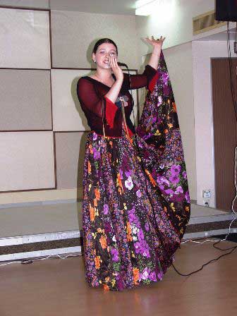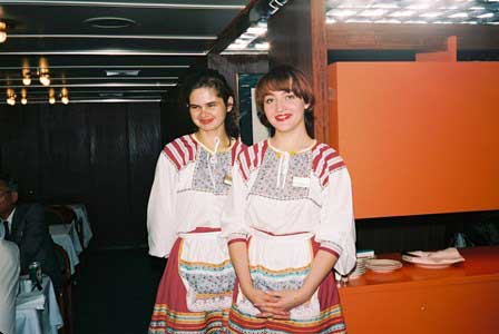 この写真のどこがウェイトレスかと言われそうだが、船旅の間ずっと私達のテーブル担当だったスヴェトラーナさん。レストランでお皿を運ぶだけではなくて、船内での催し物の時にはこうやって歌手や踊り手に変身もしなければならないから、船舶勤務も楽な仕事ではない。 (2003年8月撮影・ドニエプル川)
