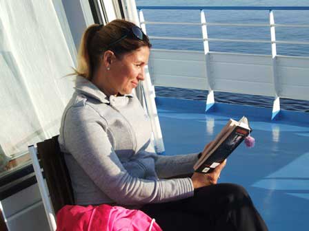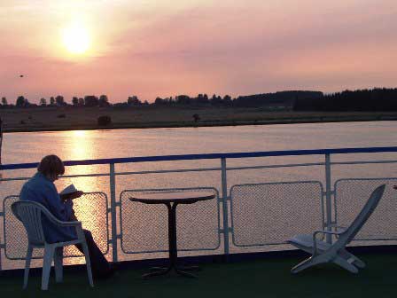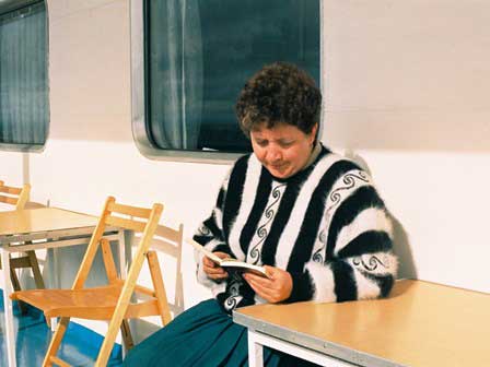 ロシアの地下鉄車内で本を読んでいる人の数は、日本の通勤電車でスポーツ紙を読んでいる人の数よりずっと多い。それほどロシア人は本が好き。写真は、時がゆっくり流れる船旅の甲板で読書にふけるご婦人。 (左:1995年8月・ボルガ=バルト水路,中:2007年8月・ボルガ川,右:2017年9月撮影・レナ川 )