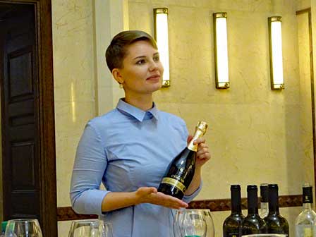 モルダヴィアも美味しいワインの産地として知られている。首都キシニョフの郊外にあるワイナリーの見学後、お客を試飲室に招いてそこで生産されるワインについて説明をするソムリエ。 (2019年9月撮影)