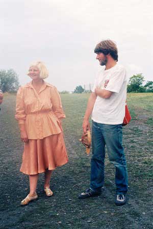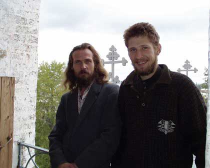 エニセイスクのウスペンスキー教会の鐘楼で観光客の相手をしていた堂守の二人。日本流に言えば寺男ということになるのだろうが、既に聖職者の風格が垣間見える。 (1999年8月撮影)