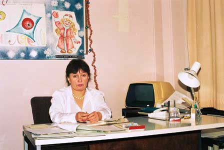 近頃のロシアのホテルはカード式だとか柄にも無いのが増えているが、かつてはたいてい自分の部屋のある階に行ってから鍵係のおばさん(ジェジュールナヤ)に鍵をもらうというシステムだった。お湯がほしいと言えばもってきてくれるし、あの家庭的な雰囲気が懐かしい。写真の人は1988年8月に3週間ほどレニングラードに滞在した折りに我々の階のジェジュールナヤをしていた婦人。5年後に再会した時のもの。 (1993年12月撮影・サンクト・ペテルブルク )