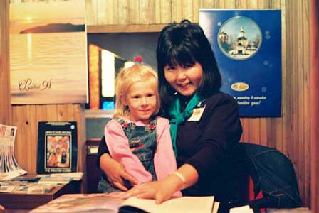 イルクーツクのホテルの1階ロビーにあるキオスク風の売店で店番をしていた係員。私ははじめ日本人ではないかと思った。 (1994年8月撮影)