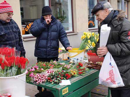 3月8日の「国際女性の日」当日に市内の市場で撮った写真。この「国際女性の日」というのはソ連時代から国民の祝日で、世の男性は必ず家庭や職場の女性に花とかその他のプレゼントを贈る習慣になっていて、万が一それを失念したりしようものなら........。 そういうわけで、この日までに、女性に贈る花を買い求める男性が花売場にたくさんやって来る。 (2014年3月撮影・リガ市内)