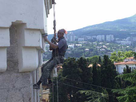 表題を「左官」とするか「鳶」とするか迷った。教会の塔の壁塗りをする職人。 (2003年8月撮影・ヤルタ市内)