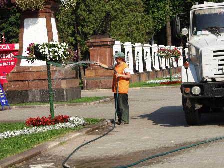 花壇の水撒きは給水車でやって来てこうする。スプリンクラーを使えばと思ったけれど、そんなものひと冬で使い物にならなくなるのが目に見えている。 (2007年8月撮影・モスクワ市内)