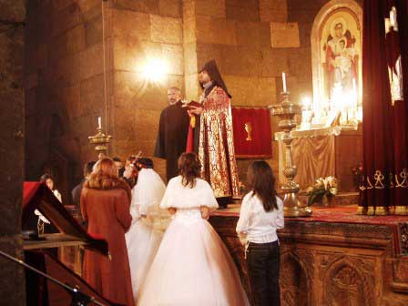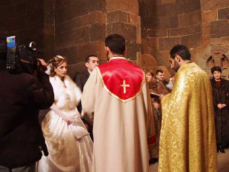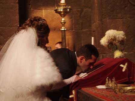アルメニアのエレヴァン郊外にある由緒ある教会で結婚する若い二人。 (2004年12月撮影)
