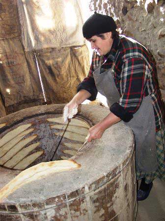 グルジアのカヘチアを横断する幹線道路沿いの村で、パンを焼く女性。熱した窯の内壁にパン生地を貼り付けて焼く。 (2004年12月撮影)