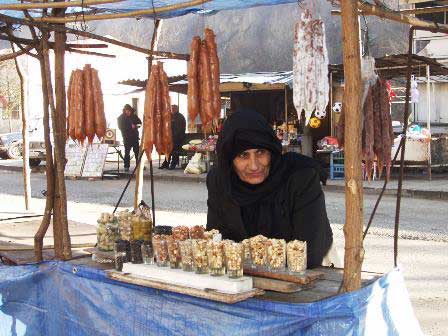 同じくカヘチアの道路沿いの小さな村で、道ばたに屋台のような小さな店を置いて、ナッツ類や正月用の菓子を売る女性。 (2004年12月撮影)