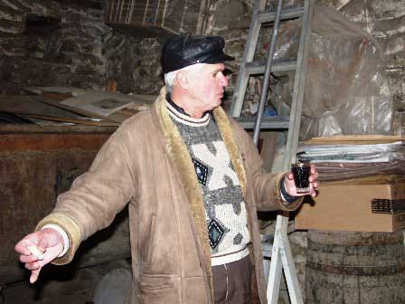 カヘチアといえば何種類もの美味しいワインで知られているが、そのワインの醸造家。酒蔵に客を案内し、ワインを試飲させるのだが、試飲といえども厳かな乾杯の辞が繰り返されるのだ。 (2004年12月撮影)