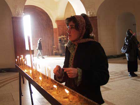 トビリシに建てられたグルジア正教の教会で、蝋燭を灯して祈りを捧げる若い女性。 (2004年12月撮影)