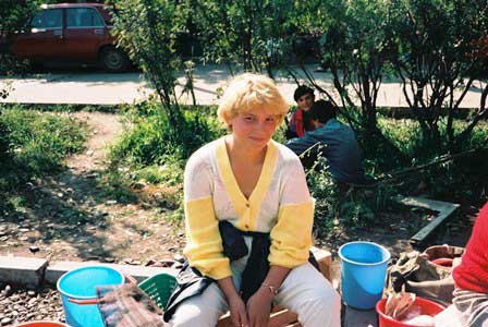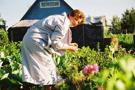 彼女が住んでいるアルハンゲリスク市が外国人にも開放されると一度町を訪ねるように何度も言われたが、私がそれを実現できたのは初めて会ってから12年近くも経ってのことだった。 下の写真はダーチャの庭で野苺を摘むカーチャ。 (1998年8月撮影)