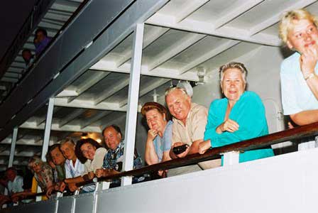 1つの船の中で幾日も過ごす船旅では、一緒に乗っている大勢のお客と仲良しになる。休暇の短い日本人は全行程を一緒にすることがなかなか難しく、途中で下船することが少なくないが、顔見知りになった人たちがこうして甲板に出て別れを惜しんでくれた。 (1997年8月撮影・サマーラ)