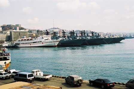 ターミナルビル付近から見た港の様子。軍民共用の港になっているようで、客船の着く桟橋のすぐ近くに病院船など軍の艦船が停泊している。左の写真は2001年春、右のは2007年暮れに撮ったものだが、その6年間船がまったく動かなかったのではとさえ思えるくらい船の配置が変わっていなくて驚いた。 (左:2001年3月,右:2007年12月撮影)