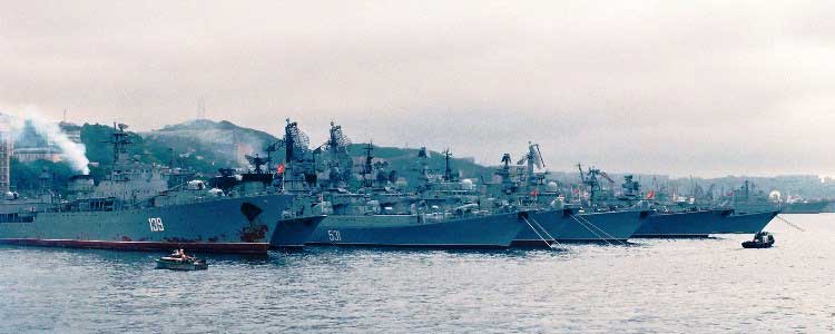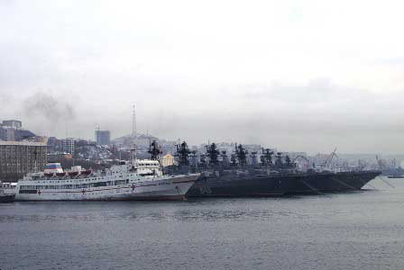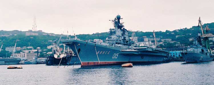 | ソ連が崩壊して市への外国人立ち入り制限がなくなったら、今度は港内遊覧船で軍艦のひしめくあたりまで案内してくれるというサービスぶりで、むしろこちらのほうがその変化について行けないという感じであった。左の写真中央の艦船は、その遊覧船から撮った停泊中の空母「ミンスク」。 (1991年8月撮影)