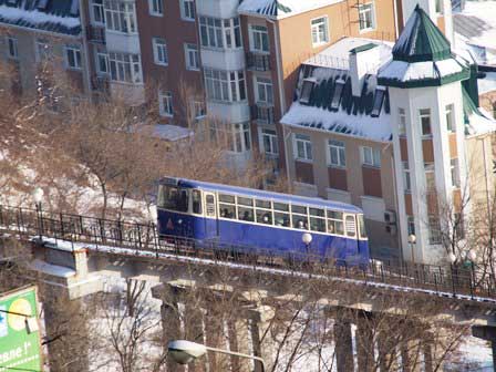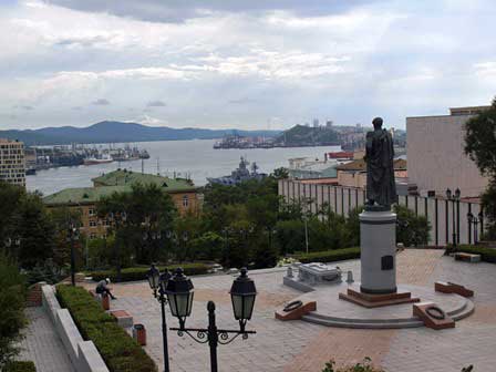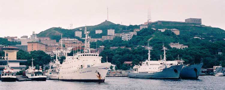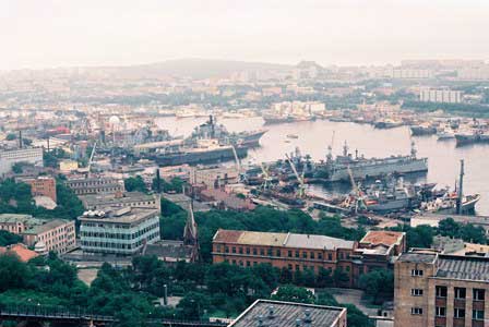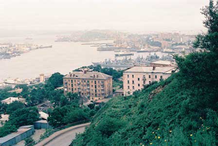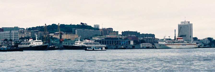 | このウラジオストクは太平洋艦隊の基地があるため、ソ連時代には我々外国人が立ち入ることはできなかった。そのためシベリア鉄道の旅もここからモスクワ行きの直通列車に乗ることはできず、近くのナホトカ港で上陸してそこからハバロフスク行きの急行「ボストーク」に乗り、ハバロフスクでモスクワ行きに乗り換えねばならなかった。1990年代になるとそれまで外国人に閉ざされていたウラジオストクが開放され、シベリア鉄道のモスクワ行き急行列車にも始発から全線乗ることができるようになったし、こうして海上や背後の高台から街を一望することも写真をとることもまったく自由になった。 (1991年8月撮影)