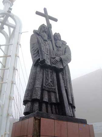 キリル文字の祖と言われるキリルとメフォディの像。港を見下ろす丘の上にある。これも、なぜウラジオストク市内にあるのか。 (2013年8月撮影)