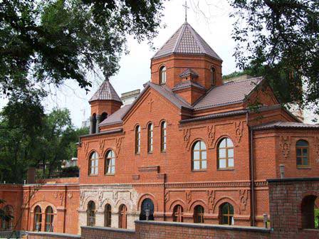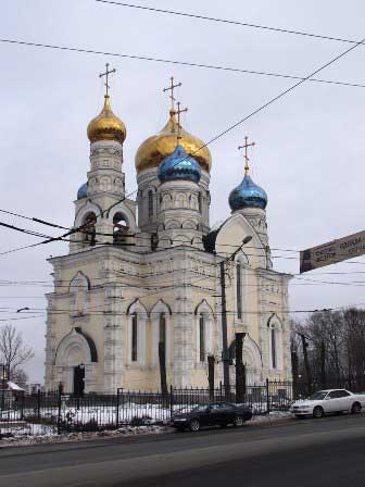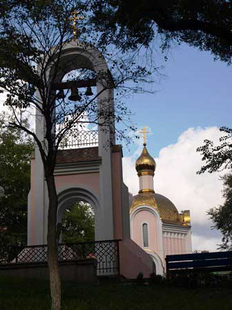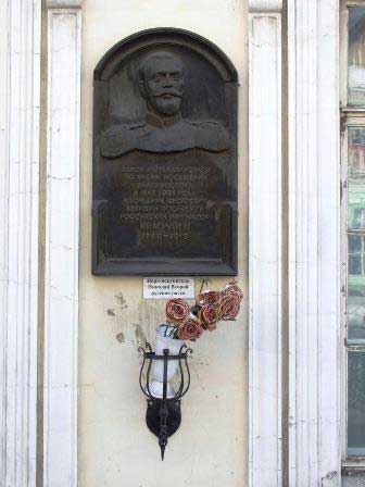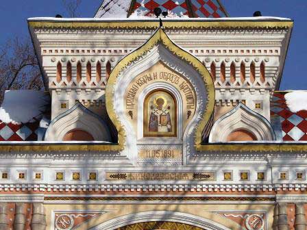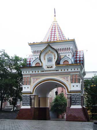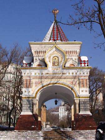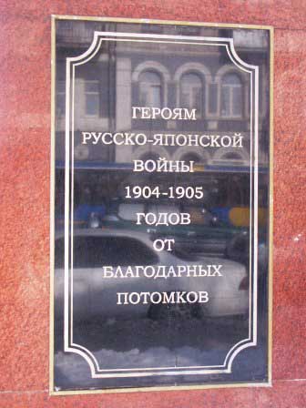 | 上の写真は、市の中心部にある比較的新しい建築物。ガイドブックには「凱旋門」とあるが、シベリア鉄道起工式のために当時まだ皇太子だった後のニコライII世がこの町に来たのを記念して建てられた門を今世紀になって再建したものだとか。門の上部に書かれた日付をもし1891年5月11日と読んでいいのなら、それってニコライ皇太子が滋賀県大津で日本人の巡査に切りつけられた日ではないのか。左の写真はスヴェトランスカヤ通りに面したある建物の外壁にあったレリーフで、ニコライがそこに滞在したとあった。 (左上のみ2013年8月、その他は2007年12月撮影)