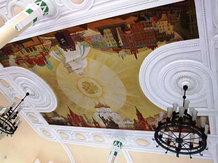 | ウラジオストクは言うまでもなくシベリア鉄道の終点。上段左の写真はその駅舎。中・下段の写真は、いずれも駅構内で、最下段右の写真は待合室の天井画。上段右は、駅舎に掲げられた「極東鉄道125周年」の横断幕。 ロシアの鉄道駅には改札口というものがないから、入場券を買わずに構内に入って写真を撮るのも自由。乗車券は、各車両の入口に立つ車掌にチェックしてもらうシステムだ。 (上段左:2001年3月,同右:2017年9月,中下段それぞれの左及び中:2007年12月、中下段いずれも右:2013年8月撮影) 前のページへ 次のページへ 目次へ戻る |  |