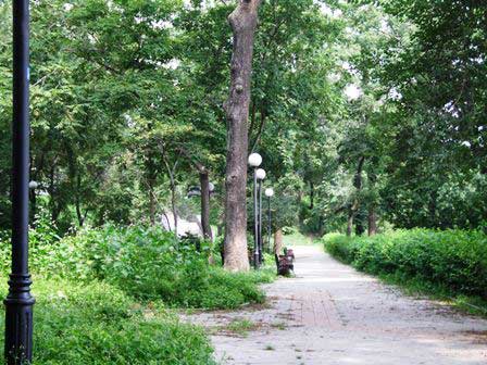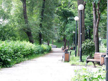 ちょうど、その橋の下あたりに、岸に沿って遊歩道が伸びている。繁華街であるスヴェトランスカヤ通りからいくらも離れていないのに、喧噪を感じさせず、落ち着くことのできる場所だ。 (2015年8月撮影)
