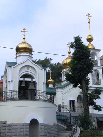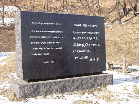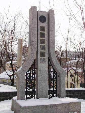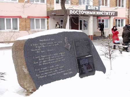 | 極東地方の名門大学。「DVGU」と略称される。右上の写真は、大学構内にある与謝野晶子の詩碑。1912年、与謝野晶子がパリにいる鉄幹に会うために、ウラジオストクからシベリア鉄道で旅立つ際に詠んだ詩だとか。左は、やはり大学構内にあった浦潮本願寺跡の記念碑。本願寺がここで20年あまり布教活動をしたというから、駿河台にあるニコライ堂のウラジオストク版か。 (2007年12月撮影) |