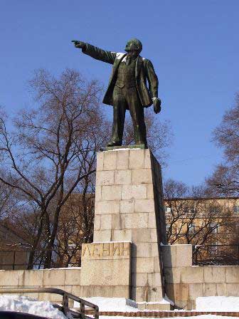 |  | 駅舎とは通りを隔てた反対側にある広場に立つレーニン像。右手を挙げるこのポーズは、かつてソ連全土に無数にあったレーニン像の典型的なタイプだ。 (左:2007年12月,右:2015年8月撮影)