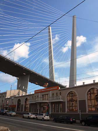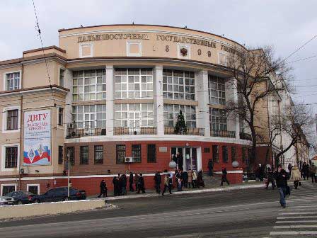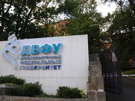 | その後、大学名は「極東連邦大学(DVFU)」と改称され、メインのキャンパスは金角湾をまたぐ新しい吊り橋を渡ったルースキー島に移転した。この写真は、ルースキー島のではなく、「本土」側にある何かの学部か、あるいはそれ以外の大学施設。 (2017年9月撮影)