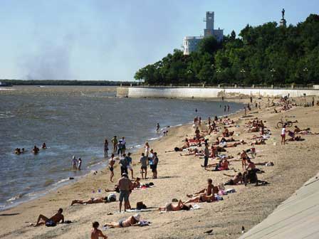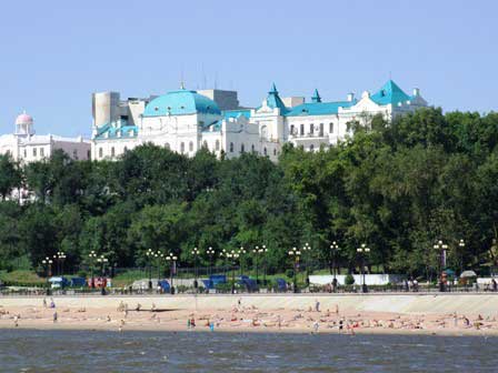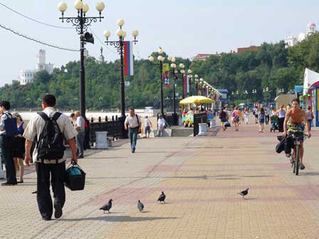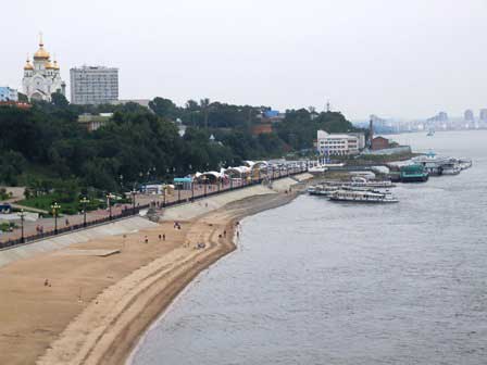 アムール河の川縁は、市民のための公園として遊歩道などが整備されていて、散歩をしたり、日光浴をしたり、泳いだり、思い思いの楽しみ方ができるようになっている。もちろん、船着き場から、船で川を遊覧するというのもありだ。 (2012年8月撮影)