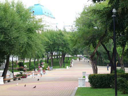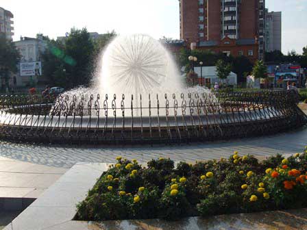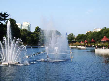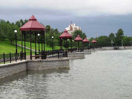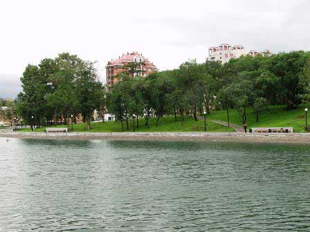 ムラビヨフ・アムールスキー通りとレーニン通りの間の谷間、日本領事館のすぐ下に写真のような人工池が出来ていた。市民の人気が高く、人々がよく遊びに来ると言われたが、写真を撮ったのは少し雨模様の早朝だったために、さすがに人が少ない。 (2002年8月撮影)