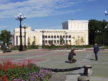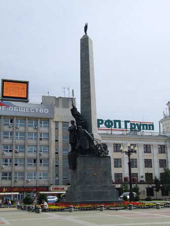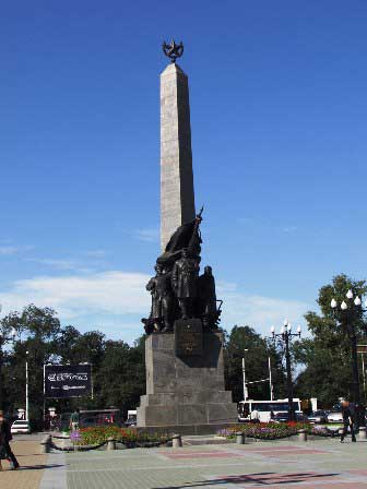 十月社会主義革命の後、ロシア全土で白衛軍との内戦が戦われた。極東のこのあたりも例外ではなく、日本のシベリア出兵など外国からの干渉もあって、厳しい戦いがあった。市内コムソモール広場にあるその内戦で戦った戦士を讃える記念碑。 (左:2002年8月,右:2012年8月撮影)