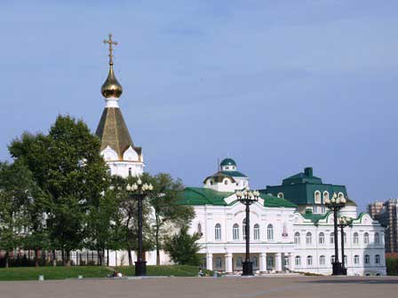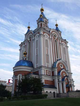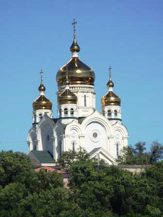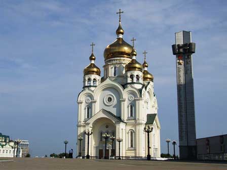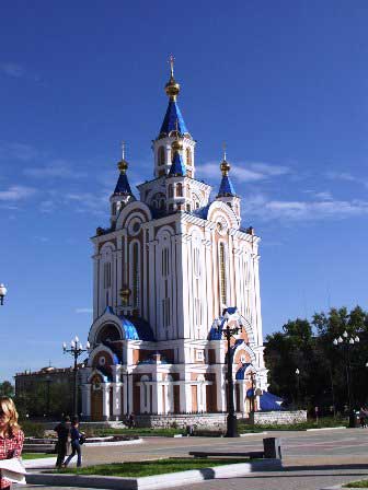 2012年に再訪したら、さらに驚いた。アムール河畔にあるもう一つの広場、こちらは内戦でなく、第二次世界大戦の記念碑のある広場の脇に、もっと新しい教会(スパソ・プリオブランジェンスキー教会)ができていた。右端の写真は、それに隣接しているものだが、たぶん別の教会なのではないのだろうか。 (2012年8月撮影)