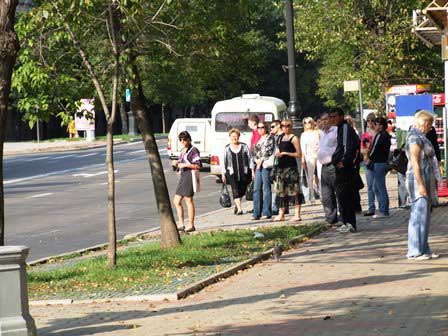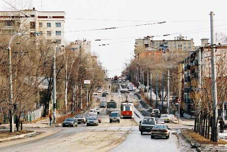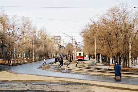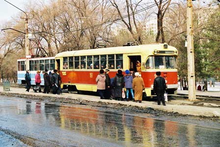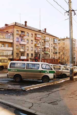 街角の風景。今世紀の始めには,既にベンツのバスが走っていたヨーロッパ部の地方都市とは違って、その時期には、まだ、この街では市電もバスもどれも車体が古かった。右ハンドルの日本の中古車がわがもの顔で走っているのも、ユジノサハリンスクやウラジオストクと同じだった。 (上;1999年3月,中:2001年3月,下:2012年8月撮影)