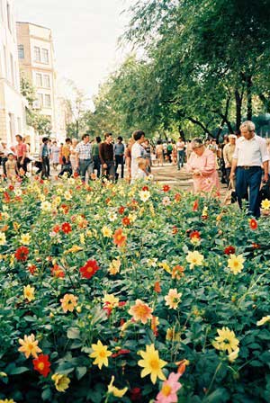 内陸に位置するハバロフスクは典型的な大陸気候で、冬は寒いのに夏は30℃前後にまで気温が上がる。しかし、市内の通りには大きな街路樹が並んでいてその陰で憩うこともできる。厳しい冬のことを思えば少々暑くても夏には活気が出る。この町には幾度も立ち寄ったが、このように寒暖の差の大きい大陸性の気候のせいか、季節によって見せる表情が全然違うのに驚かされた。 (左:1987年8月,下左及び中:1983年8月,下右:1999年3月撮影)